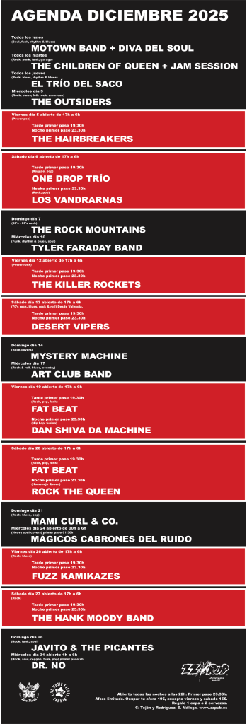 Aquí tienes nuestra playlist Spotify con temas que pinchamos habitualmente después de los conciertos en ZZPUB, para que puedas disfrutar de buena música aquellos días que no puedas venir a visitarnos. Y si no lo has hecho antes, te esperamos cada noche de la semana en el centro de Málaga con música en directo.